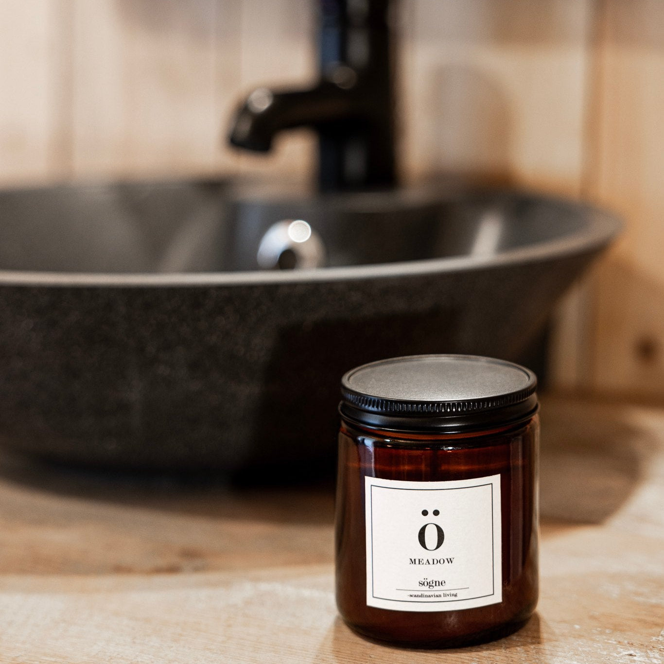 Scented candle in dark brown glas with 70% soyawax and 30% paraffin oil.