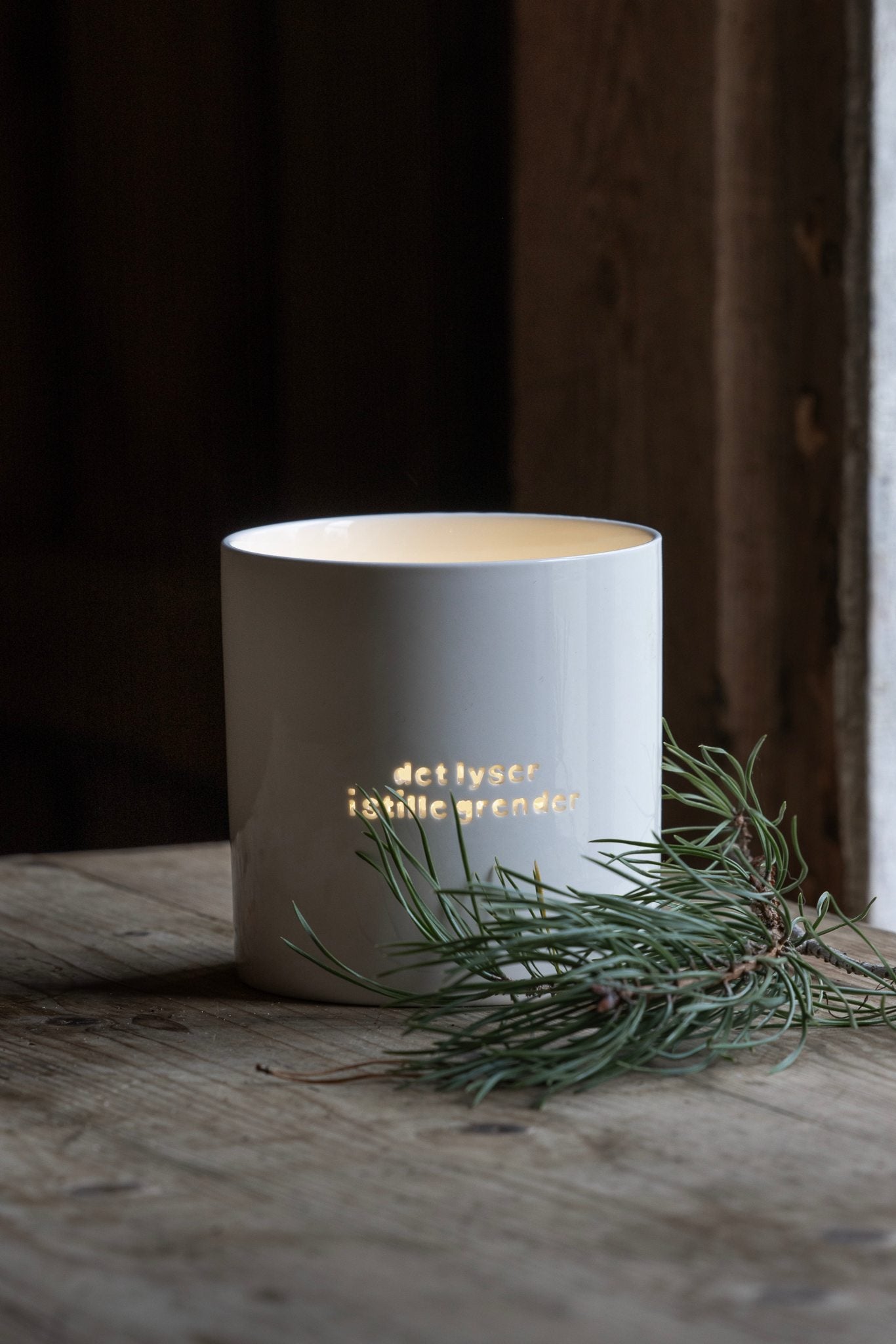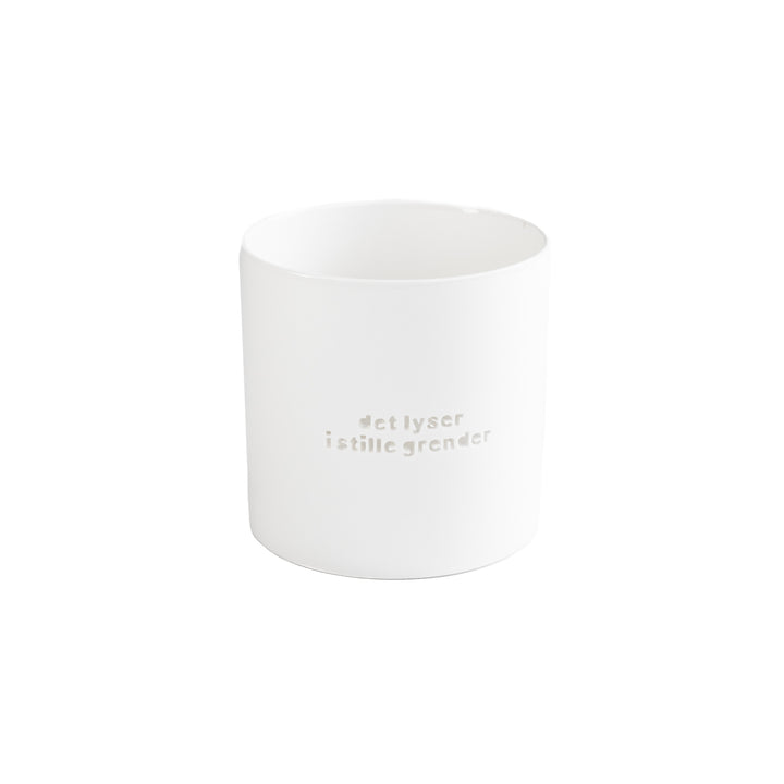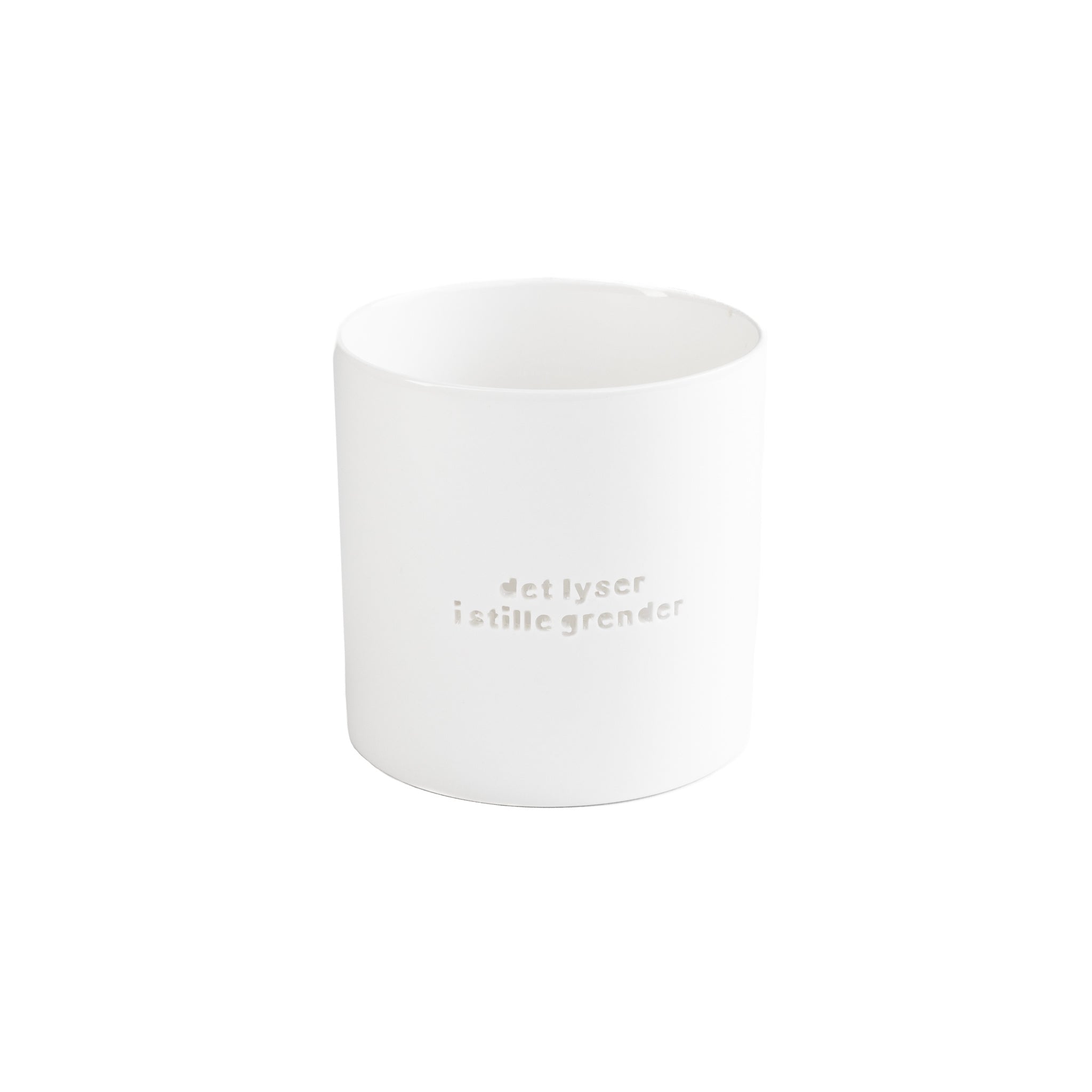 Beautiful t-lightholder in porcelain, with pattern hole text "det lyser i stille grender". Beautiful alone and beautiful in groups.