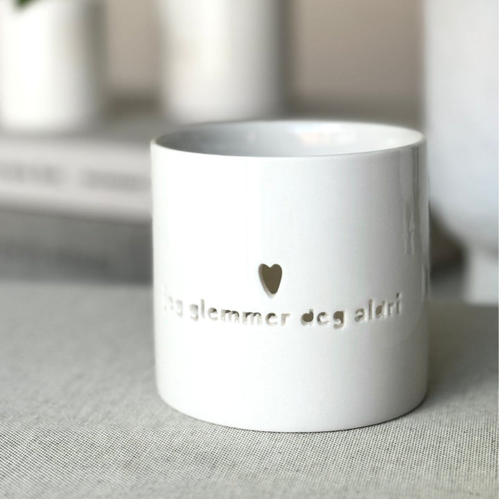 Beautiful t-lightholder in porcelain, with different hole of pattern or text. Beautiful alone and beautiful in groups.