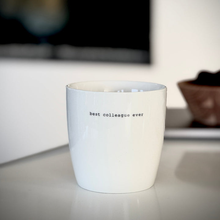 Text;" best collegue ever ". The handmade sögne mug saw the light of day in 2013, and with its thin porcelain and good handle, has become many people's favorite! Our collection of mugs comes in different sizes and selected popular texts.sögne's mugs have become popular favorites that we are proud of! With their timeless design, the mugs are made to last for generations and fill your day with an apt everyday message. The mugs are nice to use where you are with family, friends, colleagues and as a gift for various occasions. Make a difference, and look good doing it! Our products are based on global sustainability, and you can enjoy your mug with warm values with a clear conscience.*Holds 450 ml*Dishwasher safe*Refractory*Dimensions 10.5*10.5 cm.*Colour White*Text Black*Article no. 60328