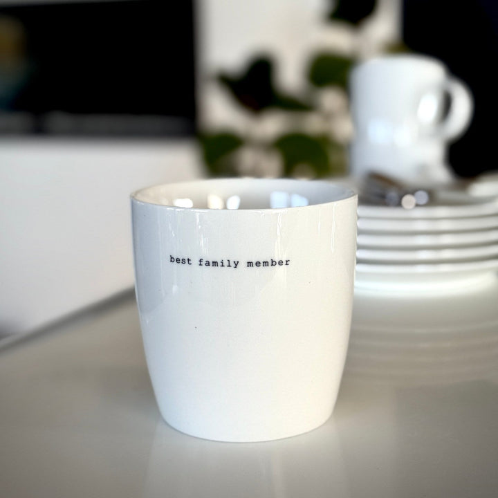 Text;" best family member ". The handmade sögne mug saw the light of day in 2013, and with its thin porcelain and good handle, has become many people's favorite! Our collection of mugs comes in different sizes and selected popular texts.sögne's mugs have become popular favorites that we are proud of! With their timeless design, the mugs are made to last for generations and fill your day with an apt everyday message. The mugs are nice to use where you are with family, friends, colleagues and as a gift for various occasions. Make a difference, and look good doing it! Our products are based on global sustainability, and you can enjoy your mug with warm values with a clear conscience.*Holds 450 ml*Dishwasher safe*Refractory*Dimensions 10.5*10.5 cm.*Colour White*Text Black*Article no. 60329