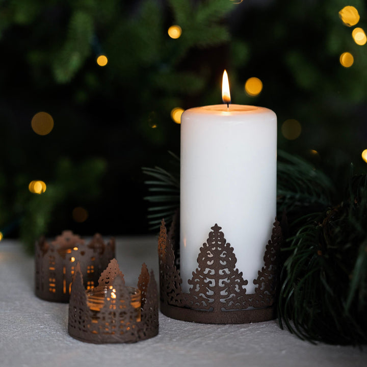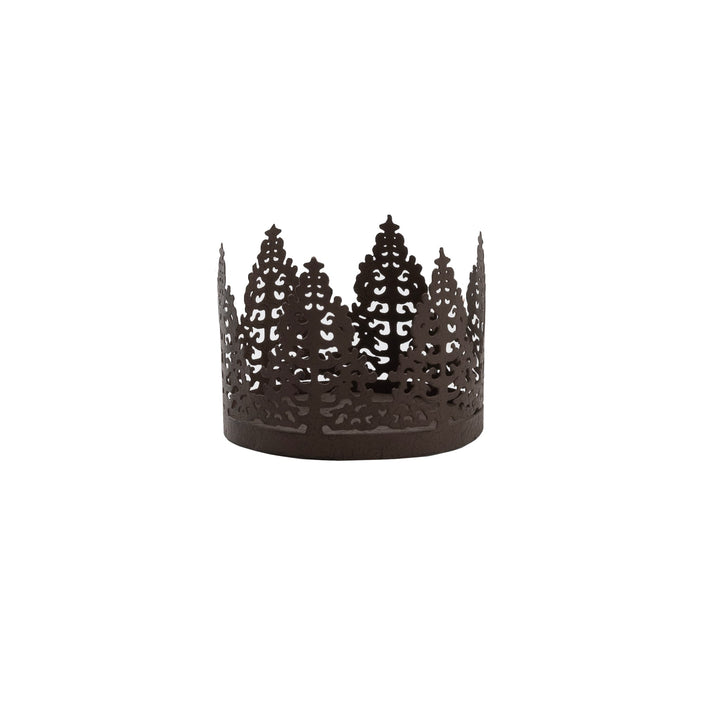 Brown metal candle holder for block candles with a motif of Christmas trees. Dimensions Ø9 H7 cmArticle number 10186