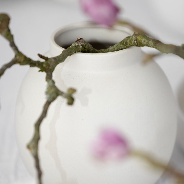 Elegant medium-sized white ceramic vase. Perfect for bouquets and as table décor. Use it on its own or pair it with other vases from the Nora series.Size: 16x16 cmColor: WhiteMaterial: CeramicItem Number. 40070