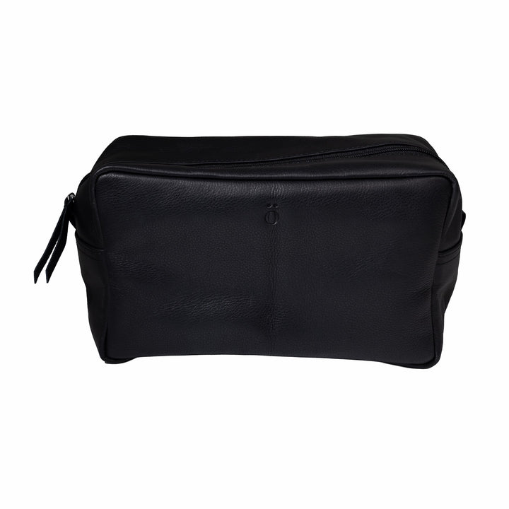 Stilren toalettveske i skinn med glidelås. Toalettvesken er fôret med stoff i matchende farge.