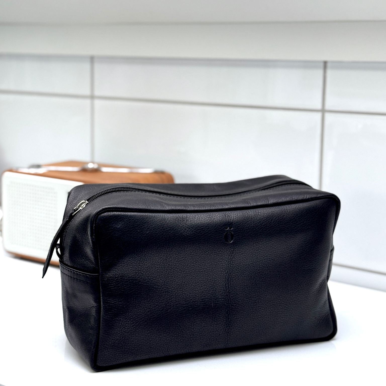 Discover our sleek and timeless toiletry bag made from durable buffalo leather. This black leather toiletry bag features a smooth zipper closure and is lined with matching cotton fabric—perfect for travel, gym use, or keeping your everyday essentials organized.