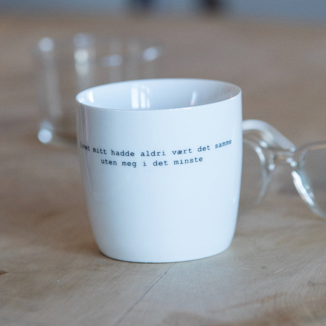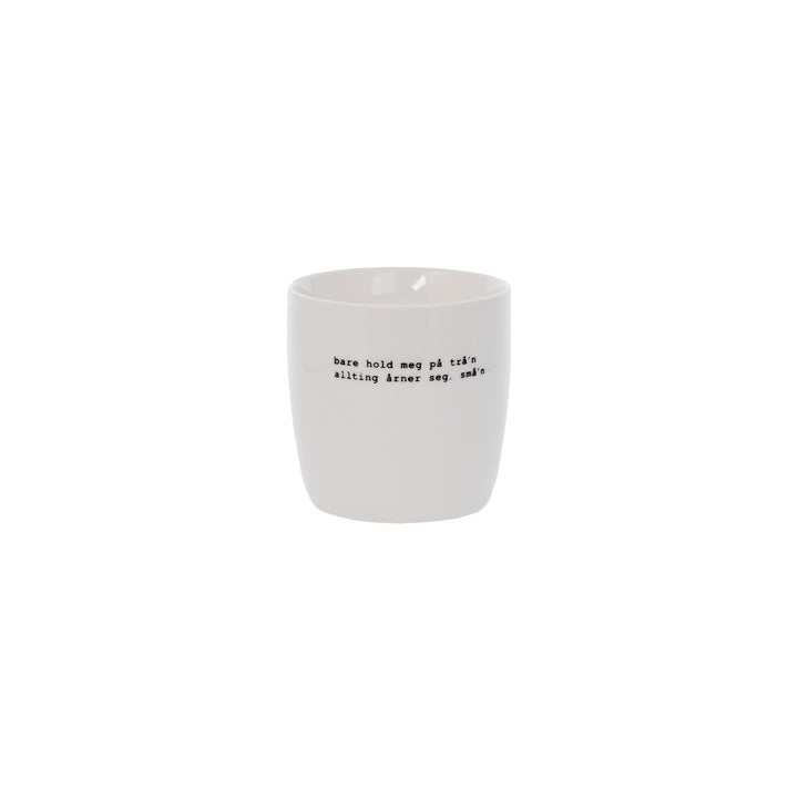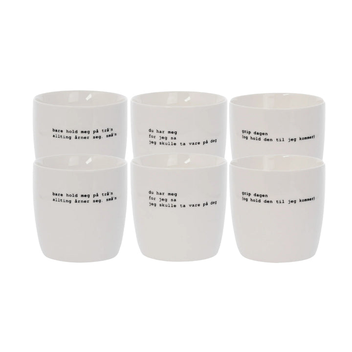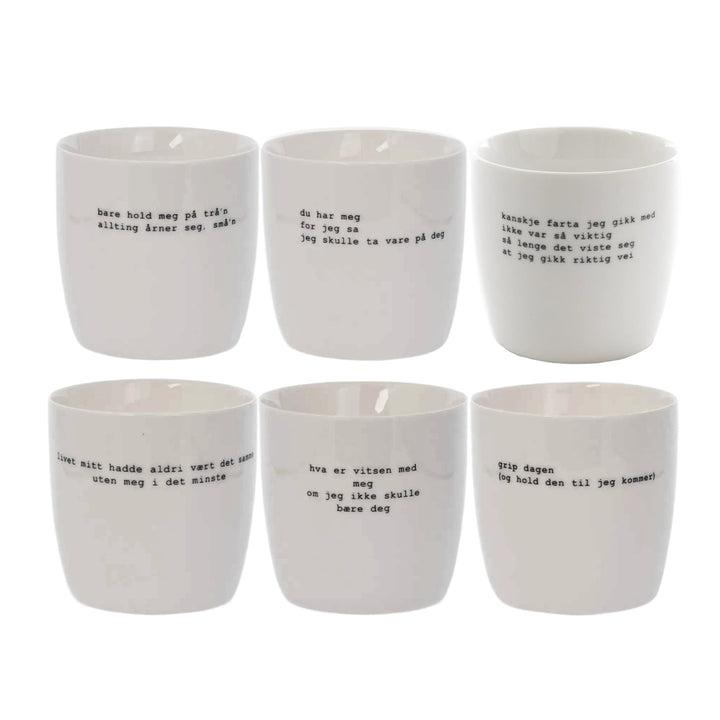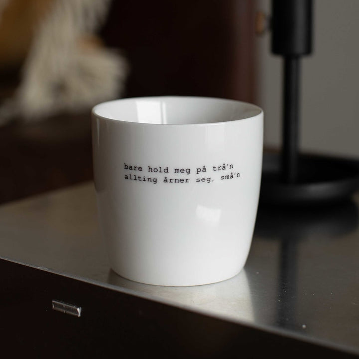 Texts; 2 x "you have me because I said I would take care of you" 2 x "just keep me on the thread everything is going small" 2 x "seize the day and hold it until I come"The handmade sögne mug saw the light of day in 2013, and with its thin porcelain and good handle, has become many people's favorite! Our collection of mugs comes in different colors, sizes and selected popular texts. Sögne's mugs have become popular favorites that we are proud of! With their timeless design, the mugs are made to last for generations and fill your day with an apt everyday message. The mugs are nice to use where you are with family, friends, colleagues and as a gift for various occasions. The lyrics on these mugs are written by songwriter, musician and poet Trygve Skaug.Make a difference, and look good doing it! Our products are based on global sustainability, and you can enjoy your mug with warm values with a clear conscience. *Holds 300 ml *Dishwasher safe *Ovenproof *Measures 9*9 cm. *Colour White *Text Black
