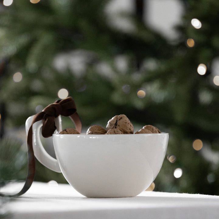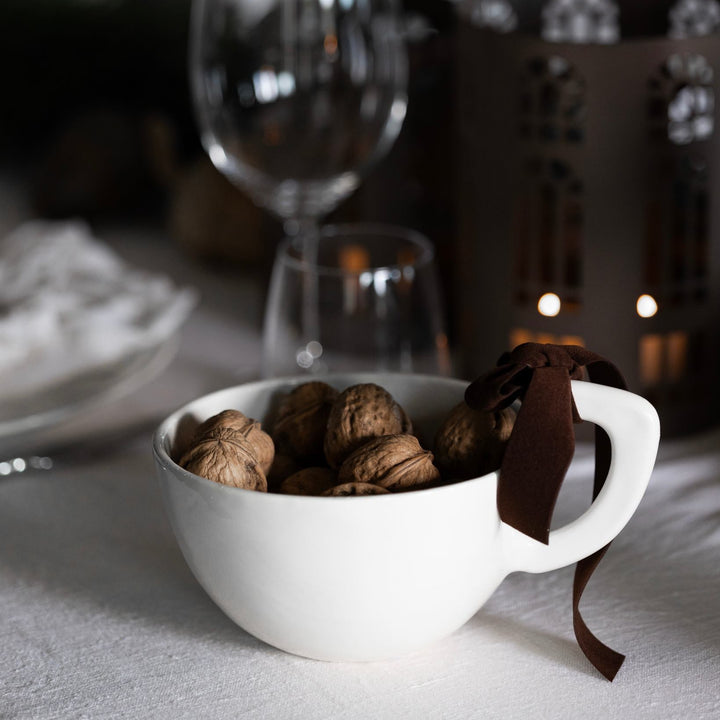 Røff liten skål m/hank i hvitlakkert metall. Like fin som snacks skål som til lys skål for kubbelys.