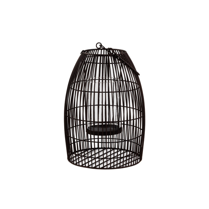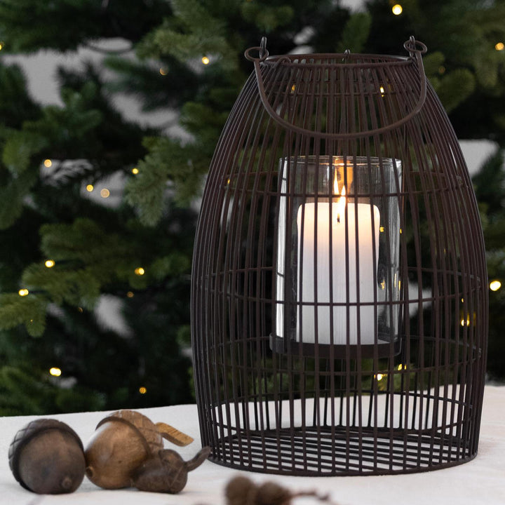 Røff lykt i brunt metall og stormglass. Denne store lykten skaper lun stemning både ute og inne i høstmørket.