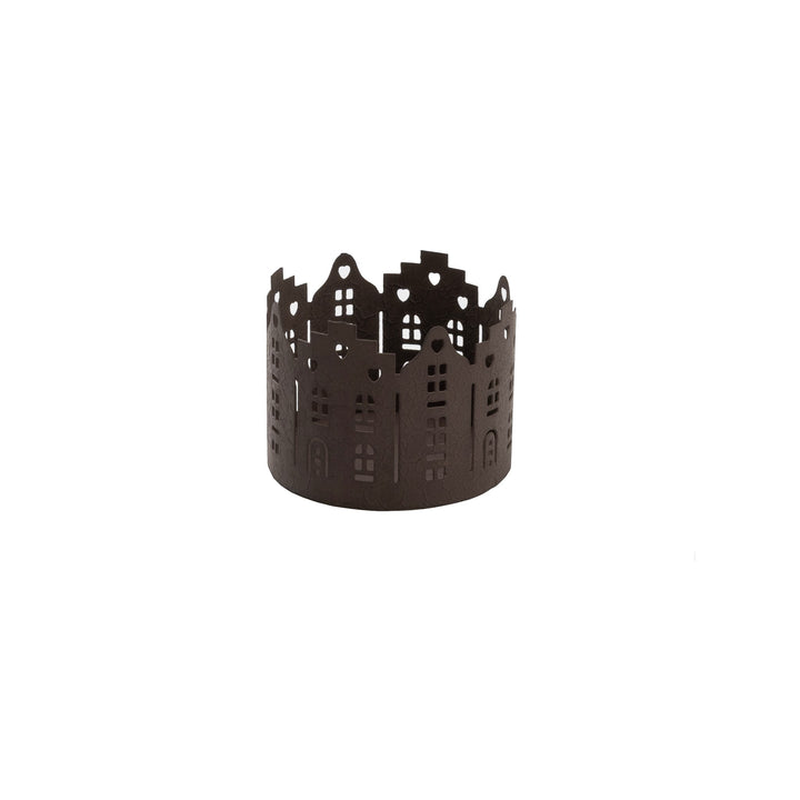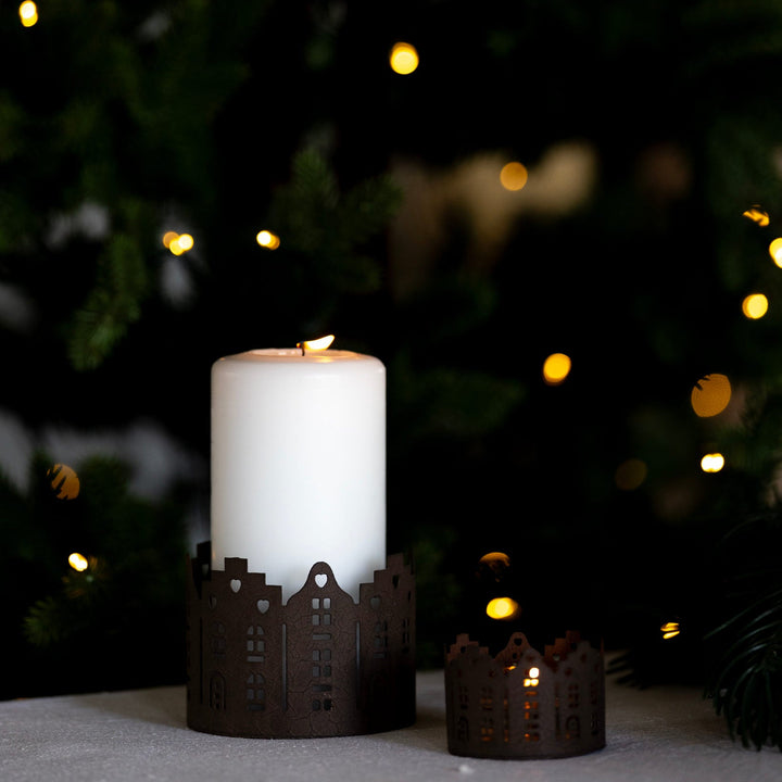 Lysholder i brunt metall til kubbelys med motiv av juleby.