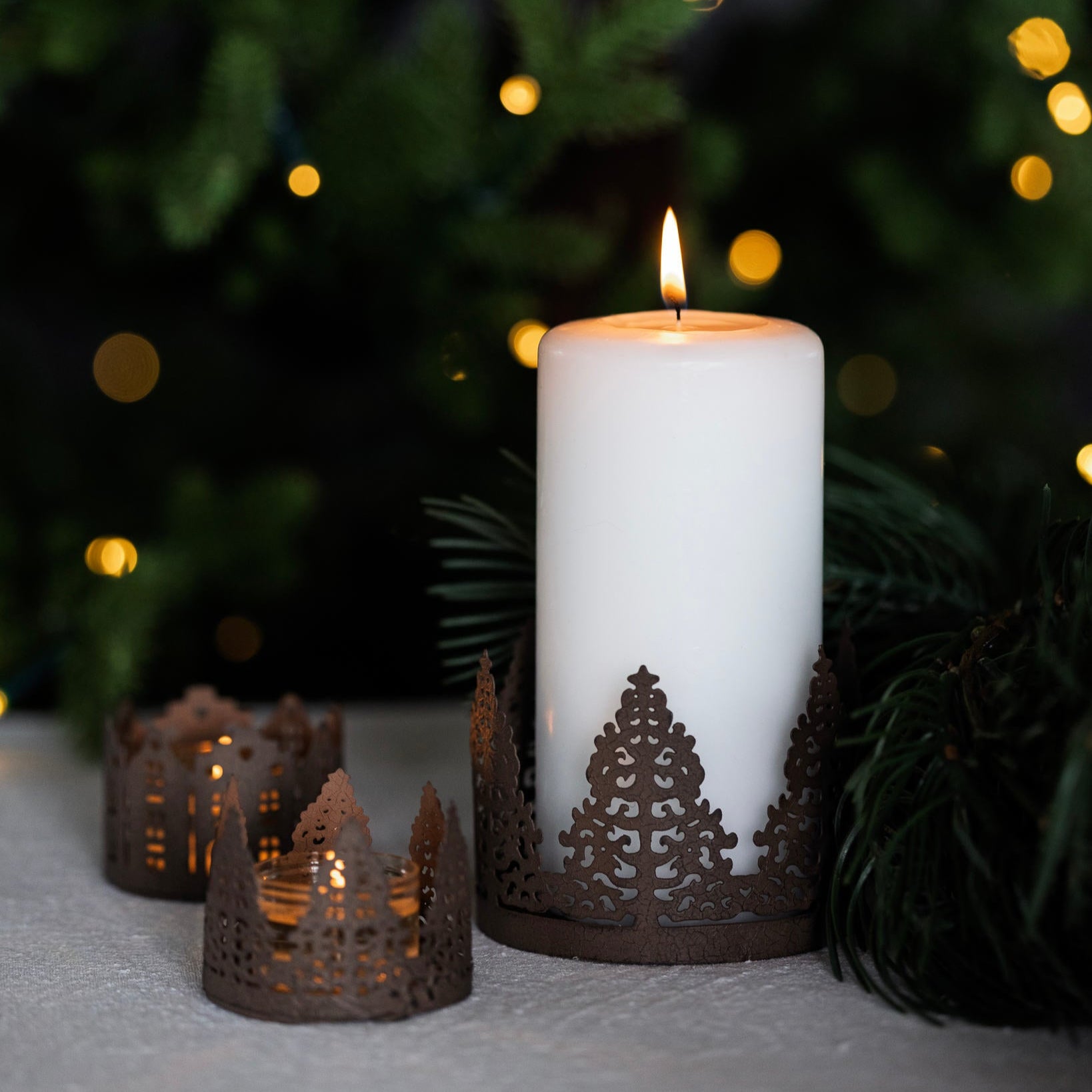Lysholder i brunt metall til kubbelys med motiv av juletrær.