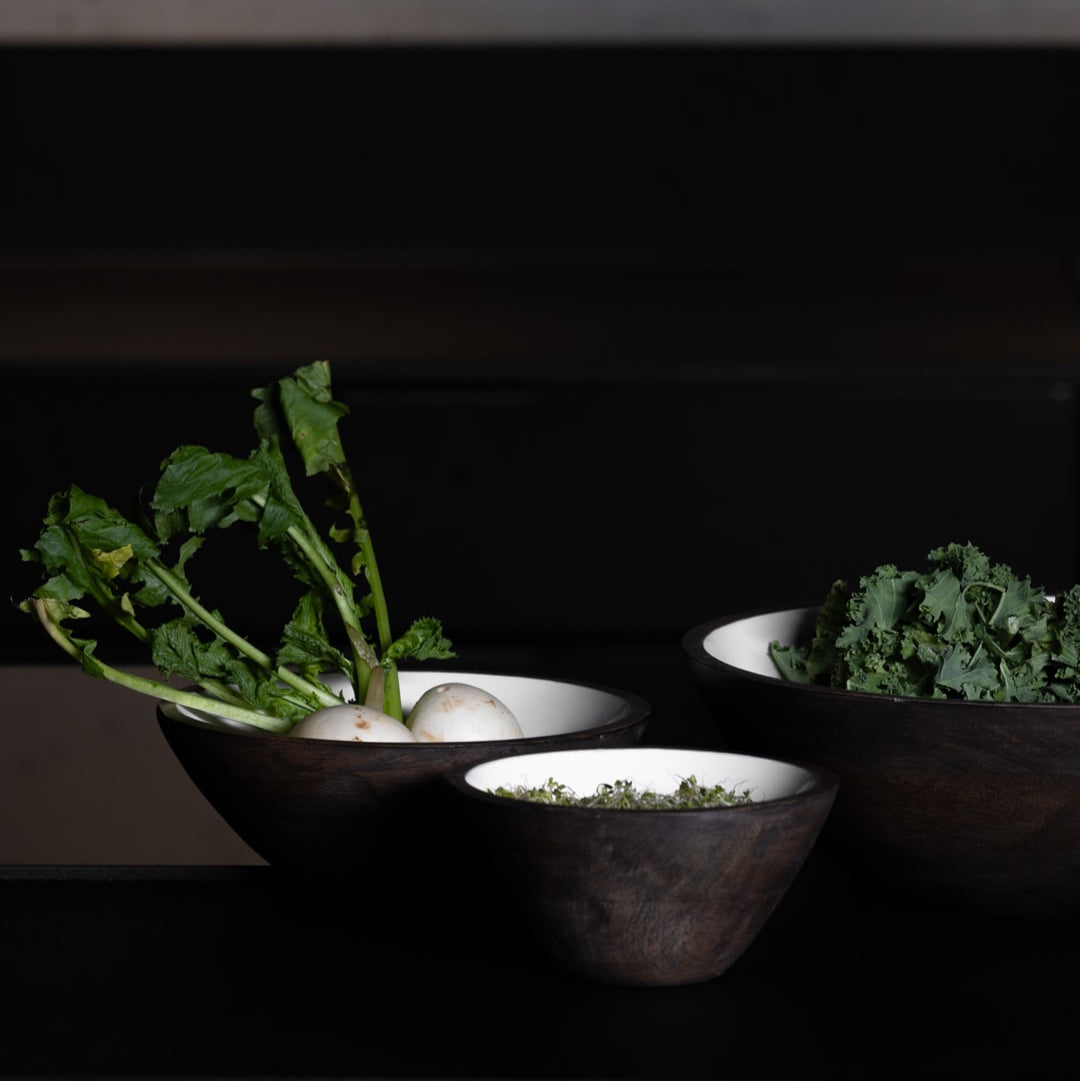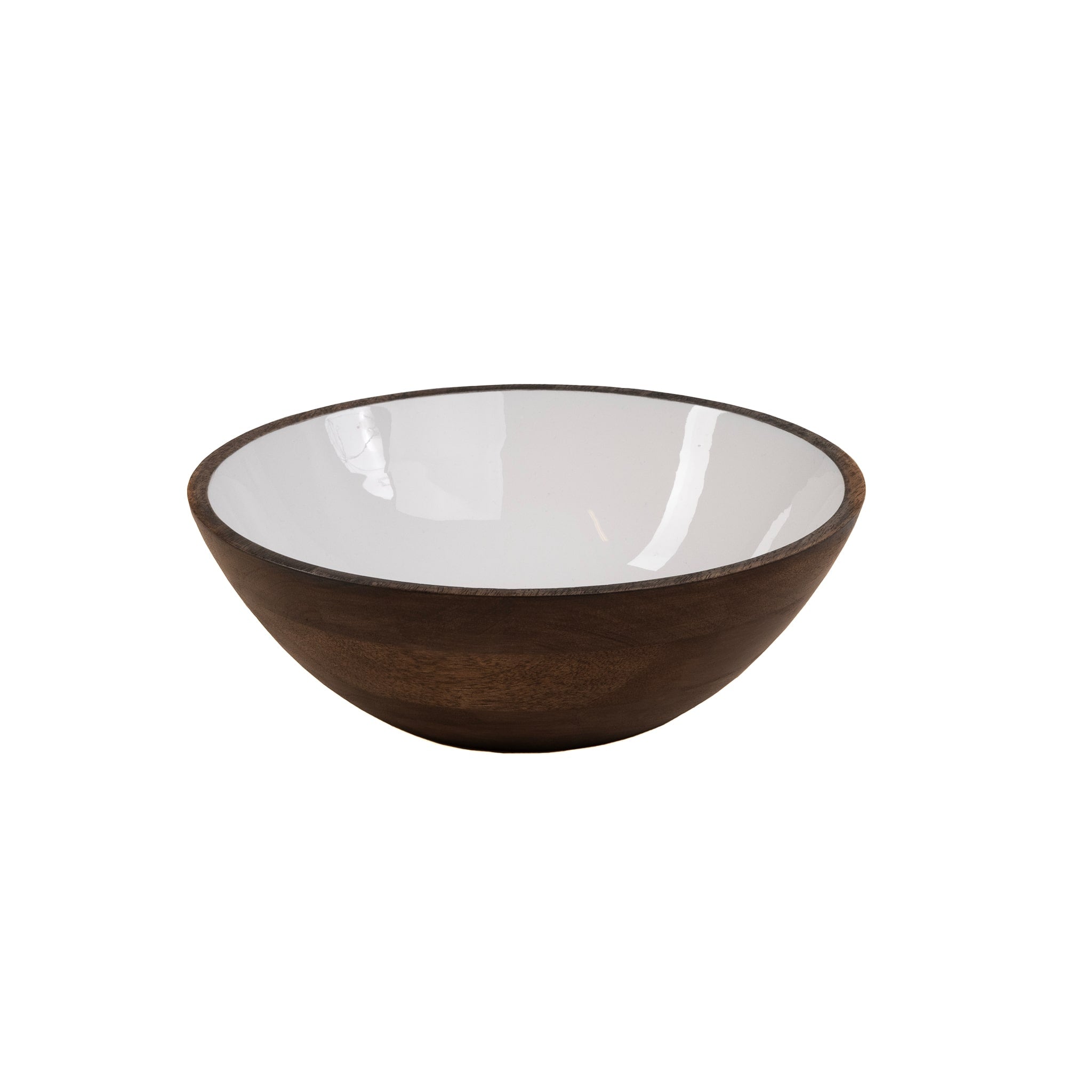 Lekker serveringsbolle i brunt mangotre med hvitemaljert innside. Etter bruk skylles fatet først i kaldt vann før det vaskes i varmt rennende vann. Utsiden av bollen kan settes inn med en nøytral matolje for å hindre at fukt trekker inn. Bollen kommer i tre størrelser.