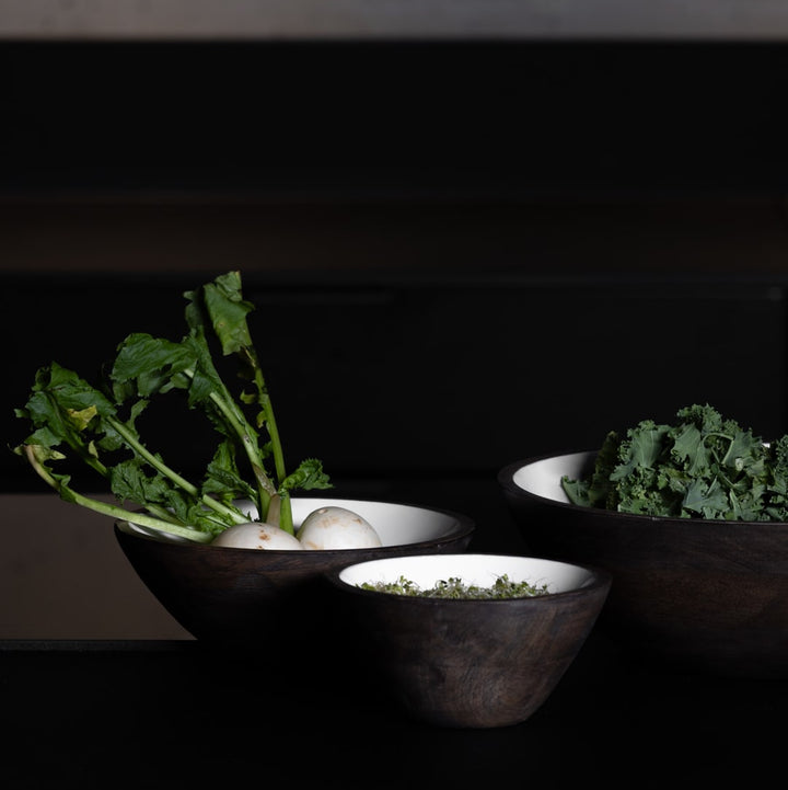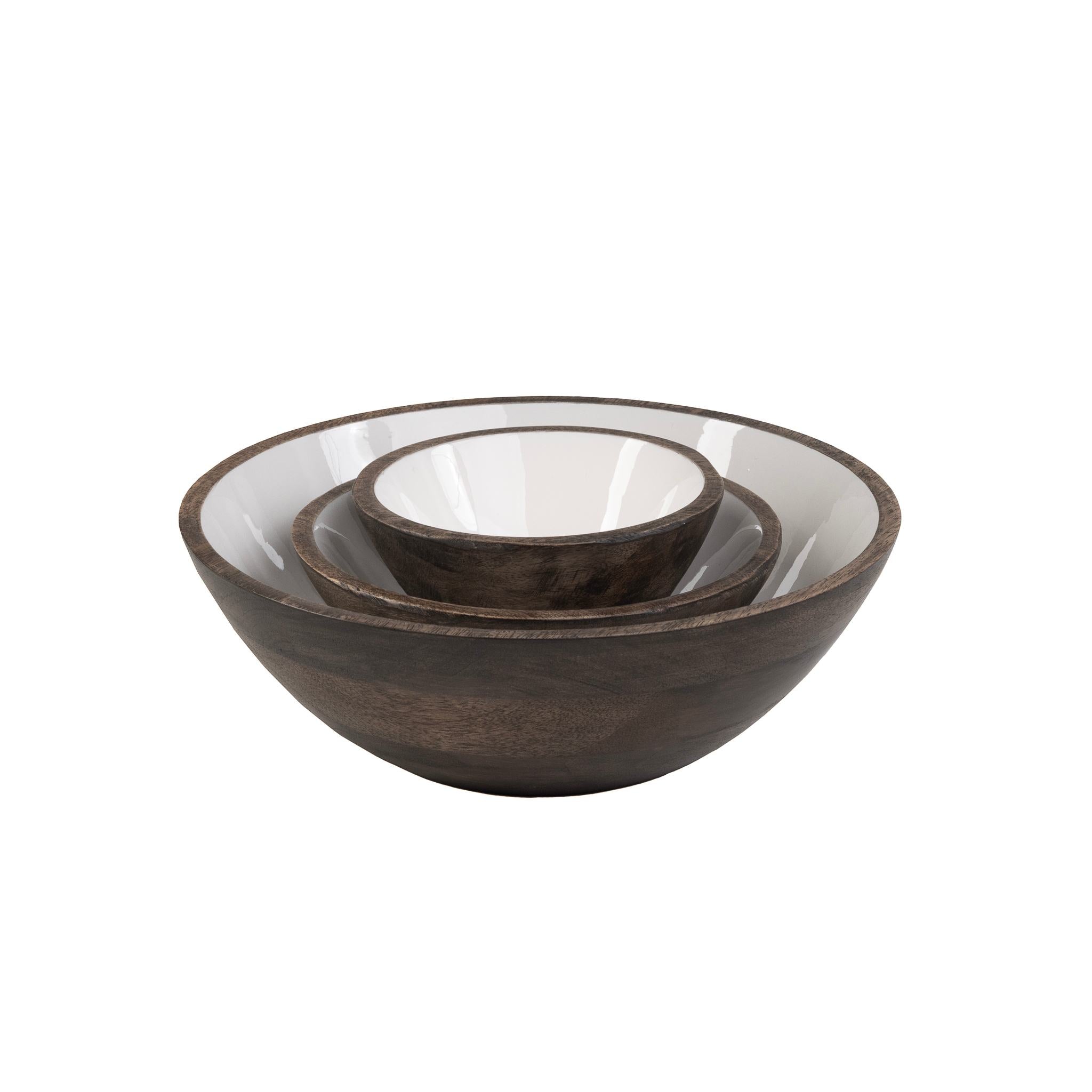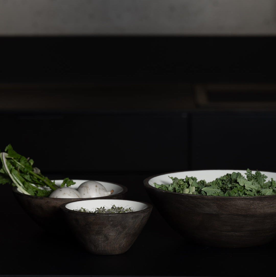 Lekker serveringsbolle i brunt mangotre med hvitemaljert innside. Etter bruk skylles fatet først i kaldt vann før det vaskes i varmt rennende vann. Utsiden av bollen kan settes inn med en nøytral matolje for å hindre at fukt trekker inn. Bollen kommer i tre størrelser.
