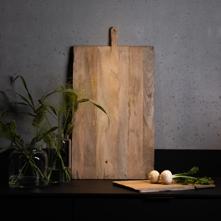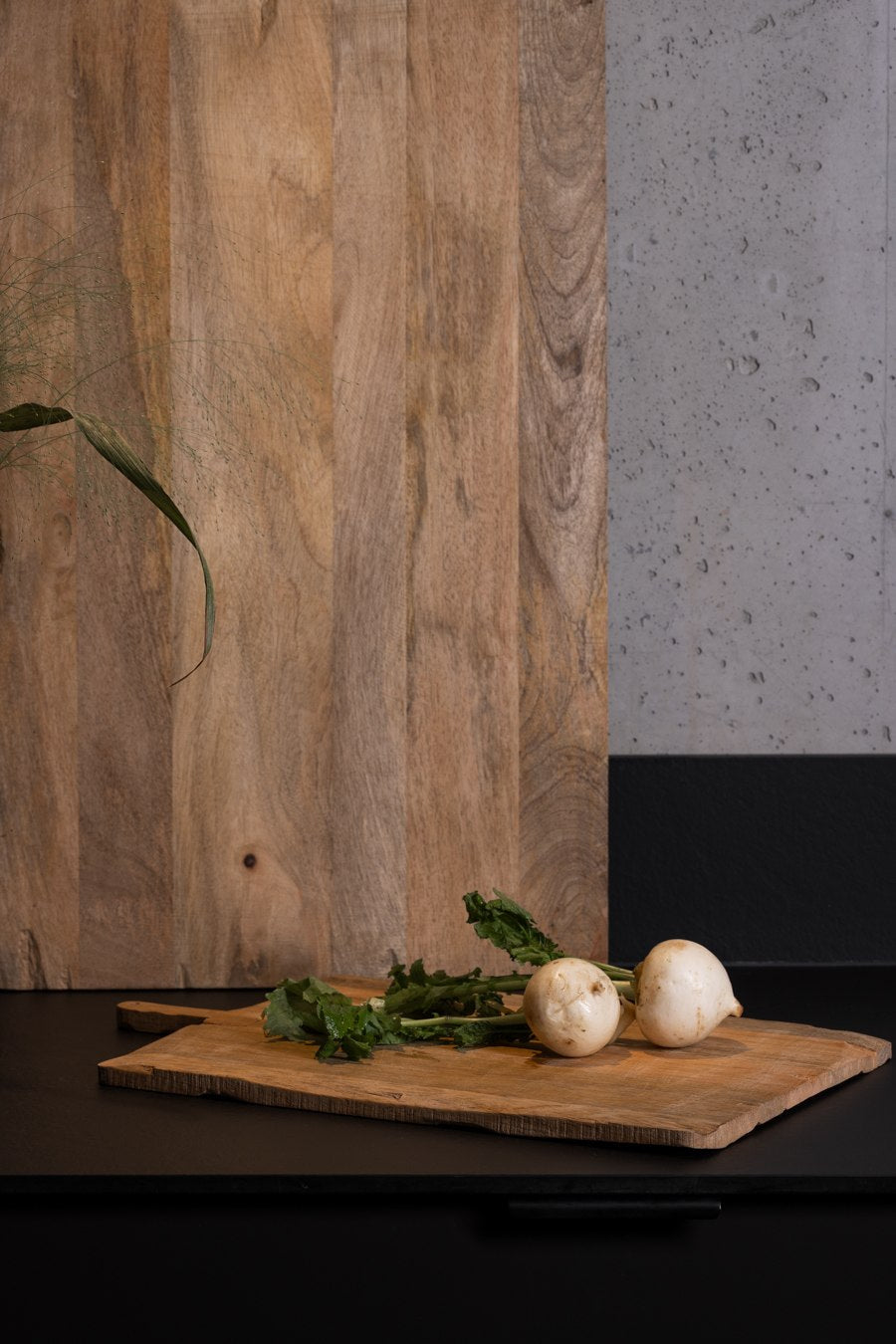 Stor skjærefjøl i rustikt mangotre. Designet gjør de fine som små serveringsfat i tillegg til at de gjør seg fint som kjøkkendekor når de ikke er i bruk. Etter bruk skylles fjølen først i kaldt vann før den vaskes i varmt rennende vann. Smør rengjorte fjøler inn med en nøytral matolje for å hindre at fukt trekker inn. Skjærefjølen kommer i to størrelser.